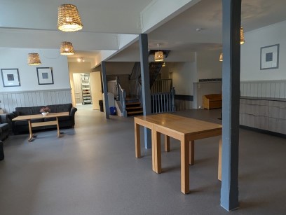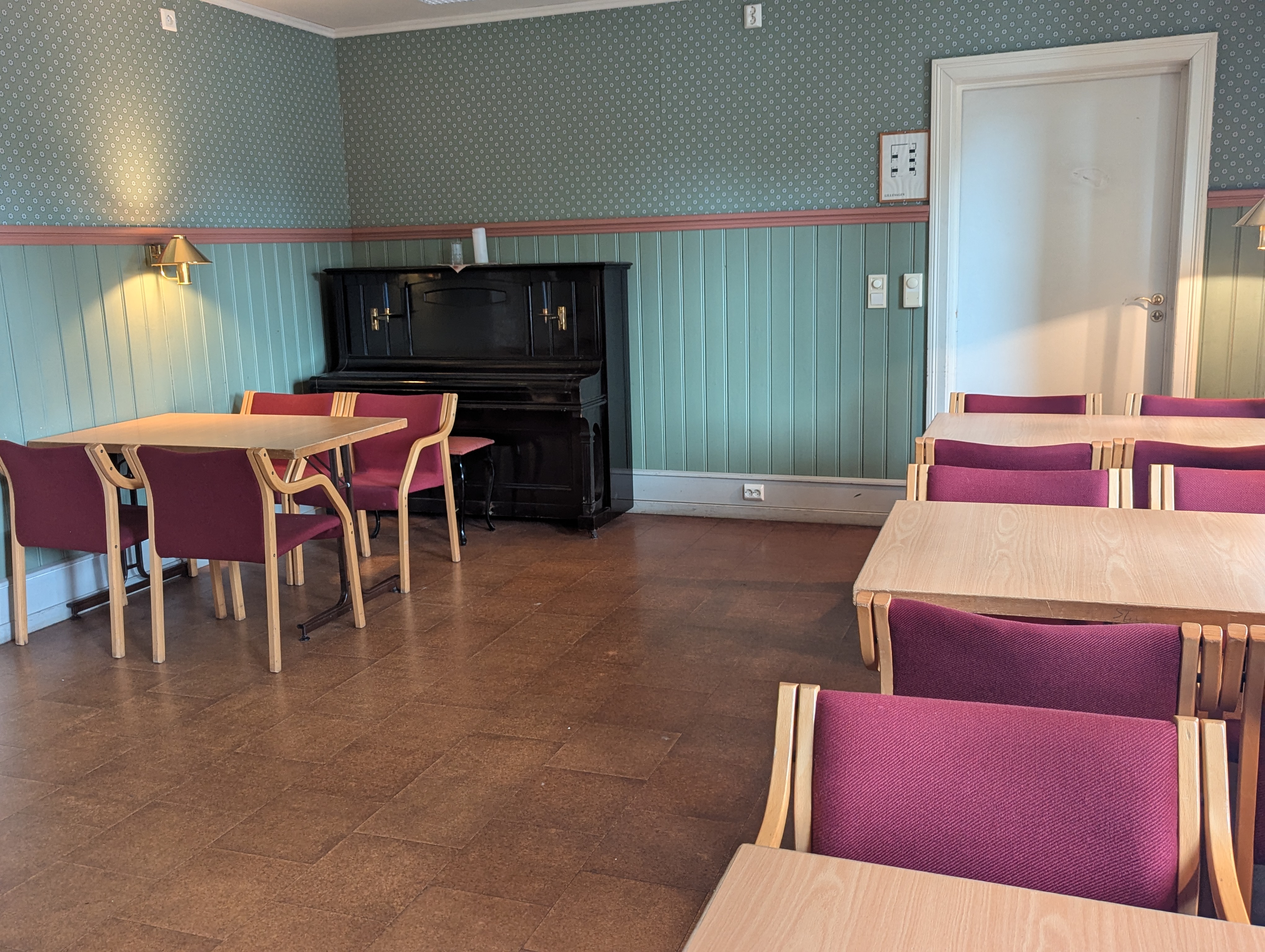 Aktivitetsrommet ligger i kjelleren og er nylig pusset opp (nytt gulvbelegg og malt). I rommet finnes piano, lite flyttbart "alter" og 10 bord/20 stoler. Smale kjellervinduer gir noe dagslys. I tillegg til taklys er det lysskinner på veggene. Det er utgang til bakgård/hage fra aktivitetsrommet, og rommet er oppvarmet med varmepumpe.
